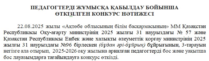 ПЕДАГОГТЕРДІ ЖҰМЫСҚА ҚАБЫЛДАУ БОЙЫНША ӨТКІЗІЛГЕН КОНКУРС НӘТИЖЕСІ